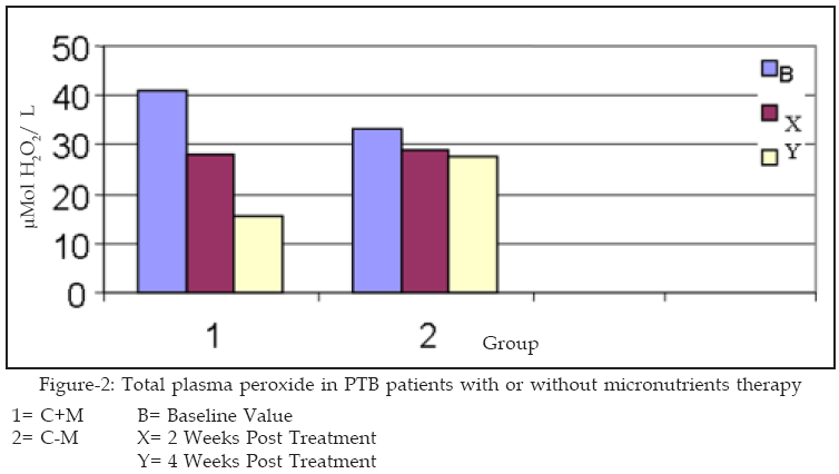 14 These products of activation are cytotoxic and need to be removed by efficient antioxidant system.15 Significantly reduced level of antioxidant activity has been reported in PTB by previous workers.1,16,17 The lower level of antioxidant activity was associated with excessive ROS, RNI production and oxidative stress in PTB.17 Increased oxidative burst is a characteristic feature of macrophage activation after M. tuberculosis invasion of the macrophage.2 Significantly higher level of TPP was observed in all our PTB patients before treatment. This significantly higher level of TPP in PTB-patients is consistent with earlier reports Kwiatkowska et al6 that high free radical load and increased level of peroxidation are futures of PTB. This level declined significantly after two weeks of micronutrient supplementation with anti-TB treatment (C+M). Anti-TB alone had no effect on the level of TPP in C-M after these four weeks of treatment. This report agrees with Plit et al,18 that plasma peroxide value is not affected by chemotherapy in PTB.The effects of micronutrients deficiency have been associated with antioxidants and immune dysfunctions in PTB.