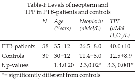 All PTB patients (Table-I) had significantly higher levels of neopterin (26.5+8.0 nMol/L; p=0.02) and TPP (40.0+10 µMol H