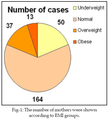 Study Parameters: Maternal age, pregestational weight, height and parity were obtained from self-report at interview. The maternal BMI was calculated by using pre-pregnant weight and height (kg/m²). BMI was classified according to the IOM’s (Institute of Medicine) criteria; BMI is called underweight when it was equal and below 19.7, overweight between 26 and 29, obese equal and above 29. The values of BMI between 19.8 and 26 are accepted normal ( Institute of Medicine).