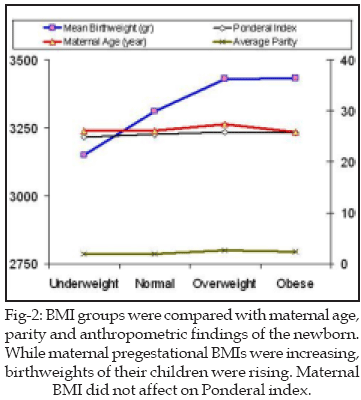 The average of BMI was found 22.95 ± 3.99 kg/m². The ratio of mothers according to BMI groups is shown in Fig-1. The mean values of the birthweight and Ponderal index based on prepregnancy BMI are shown in Table-I. When BMI groups were compared with birthweight (p:0.026) and parity (p:0.02), It was determined significant relation statistically. Statistical differences were not determined between maternal pregestational BMI and newborn Ponderal index (p:0.466). Parity was compared with birthweight and ponderal index. Any relations were not determined (p:0.674, p: 0.386). All these relations were shown in Fig-2.