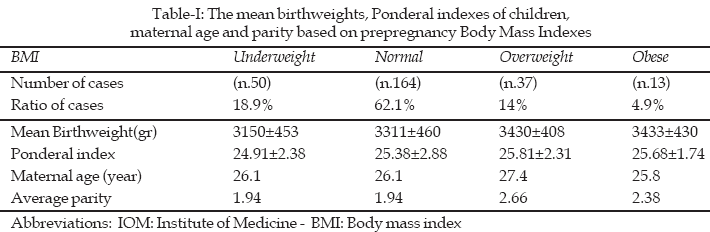 The average of the newborn birthweights was 3303.8 ± 456.8gr, height was 50.5 ± 1.9 cm, head circumference was 34.6 ± 1.7cm and Ponderal Index was also found 25.36 ± 2.65. On the other hand, 91.3% of the baby (n.241) had birthweight in normal ranges. 4.5% (n.12) of newborn were below 2500gr and 4.2% (n.11) were above 4000gr. The average of maternal pregestational weight was found 60.4± 11.6kg, maternal height was 161.8±5.6 cm and gestational weight gaining was 13.8±6.1kg.