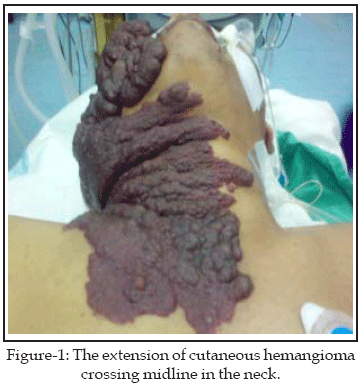 A 49 years old Malay male was diagnosed to have olfactory meningioma. Premorbidly, he was having an extensive cutaneous hemangioma which involved half of the head. The lesion on the neck slightly crossed the midline (Fig-1). He was posted for general anaesthesia for the tumour excision by neurosurgical team. Post operatively, he showed poor recovery which necessitated prolonged ventilation up to nine days via endotracheal tube. In addition, he was having a lot of tracheobronchial secretion.