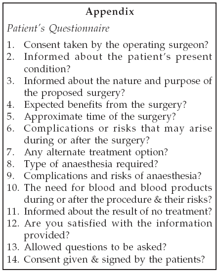 Patients and Methods: Patients who had undergone elective surgery were interviewed randomly during the study period under routine practice conditions. All the patients were asked a set of standard questions post operatively related to the information they were provided before the procedure as a part of standard informed consent practice. Questionnaire included the patient’s knowledge about pathology, operative risks, type of anaesthesia given with its risks, alternate treatment option, results of no treatment, patient’s satisfaction about the information given and whether consent form was signed.