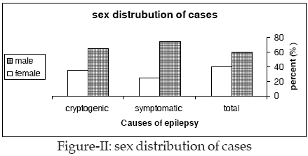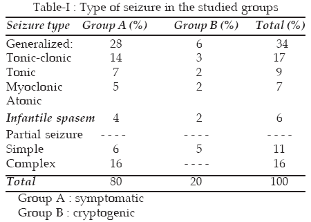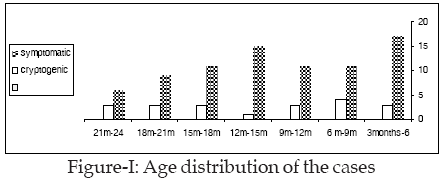 Patients were divided clinically into 2 groups: Group A (symptomatic) 80 cases (80%): included those who had evident etiology, evident neurological deficit or developmental delay of significant degree prior to onset of seizures a Group B (cryptogenic) group-20 cases (20%): this comprised children who had apparently no antecedent etiology, no neurological disorder and who had normal development until the onset of seizures. the age and six distribution of the patients is presented in Figure-I & II.