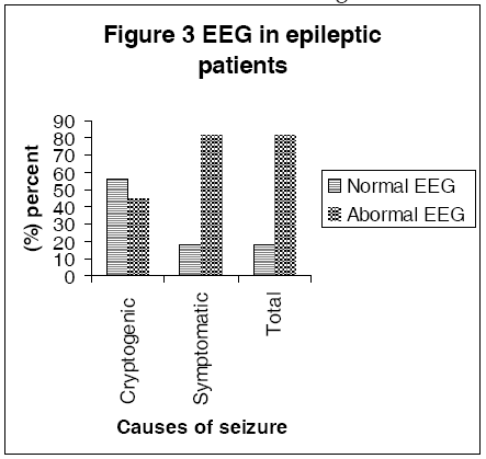 In all patient male to female ratio was 1.5: 1 male preponderance appear more evident of symptomatic group 3:1 as shown in the Figure-II. The etiological factors encountered were perinatal asphyxia (55%); prematurity (5%), CNS. infections (15%), head injuries (8%), congenital anomalies of central nervous system (9%) and heredofamilial disorders (8%). The generalized tonic-clonic seizure was the commonest in both groups while infantile type was least common (5%) Table-I. EEG was normal in 18 % of cases (abnormal 82.2 % in group A and 56.7 % in group B) as showed in Figure-II. 44% of patients had normal clinical examination as well as development while 27 % were mentally handicapped. The head circumference in group A was between 5th and 9th percentile in 27 cases (33.75%) above 95th percentile in 15 % of cases. In group B, it was between 5th percentile and 95th percentile in all cases.