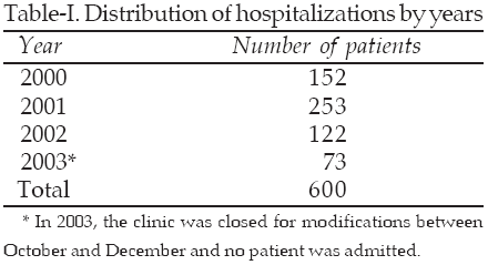 During the study period a total of 600 patients were hospitalized to receive therapy. The distribution of hospitalizations by years is shown in Table-I.