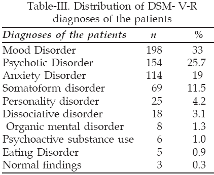 In terms of DSM-IV-R diagnoses of the patients, the most common diagnoses were mood disorder in 198 patients (33%), psychotic disorder in 154 patients (25.6%) and anxiety disorder in 114 patients (19%).