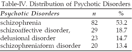 Depressive disorder constituted 62% (123 patients) and bipolar affective disorder constituted 38% (75 patients) of the most common mood disorders. Of the psychotic disorders, 53.2% were schizophrenics, 18.7% were suffering from schizoaffective disorder and 14.7% from delusional disorder, 13.4% were schizophrenia form disorder.
