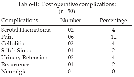 The mean operating time for unilateral inguinal hernia repair was 40 minutes (range 30 to 50) and for bilateral repair was 63 minutes (range 50 to 70).A reduction in operating time for both unilateral and bilateral repairs was noted over time, consisting with increased operator experience. The complications that occurred within the first 6 weeks postoperatively are summarized in (Table-II). Minor complications were noted in 28% of cases and were managed conservatively in most patients except two patients having stitch sinus. Major complication was noted in one patient who developed recurrence in recovery just after operation. The suspected cause was diffuse laxity of the abdominal wall which was not corrected laparoscopically.