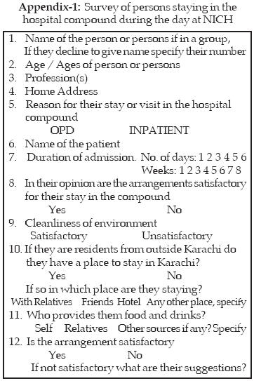 A questionnaire based cross-sectional survey was conducted on 200 randomly selected people in the compound of NICH (National Institute of Child Health, Karachi) during the peak hospital hours during the month of July 2004. It was a part of our voluntary work at the Child Aid Association. The survey was conducted in Urdu with the help of a questionnaire (Appendix-1).