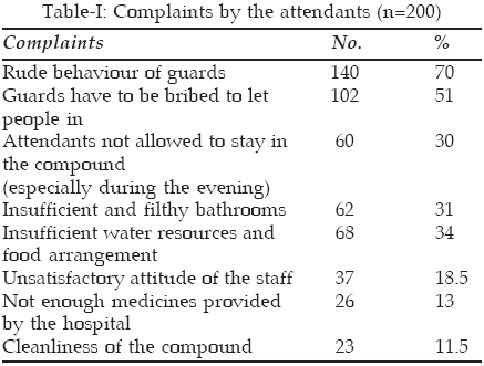One hundred and forty two people (71%) were satisfied with the cleanliness of the hospital compound and 50% were satisfied with the arrangements for stay of attendants in the hospital compound. Their major complain was about the attitude of the guards. The other problems they faced are given in Table-I.