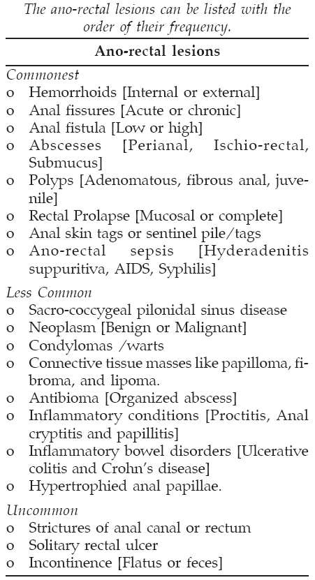 Treating an ano-rectal pathology: While majority of the ano-rectal lesions could be treated with a conservative approach, the primary care physician should be able to distinguish complex pathologies that need an expert care. Common pathologies encountered in the general practice setup include-