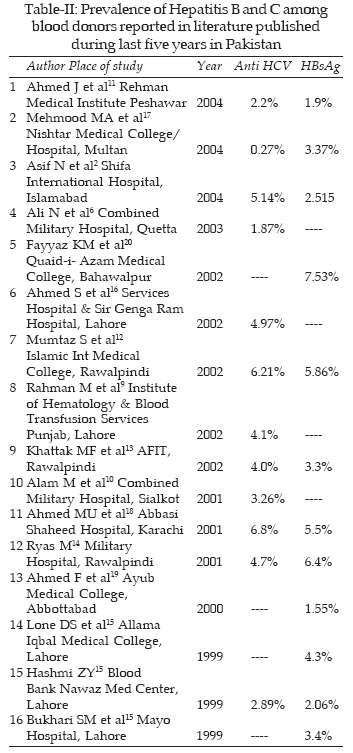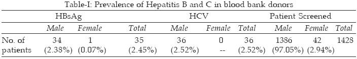 A total number of 1428 donors who were declared physically fit for transfusion were screened for HCV and HBsAg. Among them majority (97.05%) were males. 2.45% among them were seropositive for HBsAg and 2.52% for HCV. Males are predominantly seropositive for HCV and HBsAg i.e. 2.52% and 2.38% respectively (Table-I). Table-II shows prevalence of Hepatitis B and C among blood donors in different studies conducted from different parts of country and published during last five years. A total number of sixteen papers were published during last five years and their review shows that the seroprevalence of Hepatitis C ranges from 0.27% to 6.8% and seroprevalence of Hepatitis B ranges from 1.55% to 7.53% in different parts of the country.