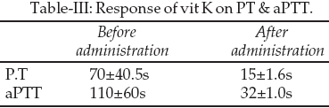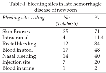 The sites of bleeding on admission are shown in Table-I. The clinical manifestations are shown in Table-II. Majority of the infants (71%) presented with skin bleeds which were noted by the parents. In physical examination; there was bulging or full fontanel in three patients (8.5%), diminished or absent neonatal reflexes in nine patients (24%) and ecchymosis in 25 patients (71%). Rectal bleeding 12(34%) and oral bleeding findings were found in 11 (73%). Table-III shows response of Vit K on PT and aPTT both of which were corrected by it within 24 hours.