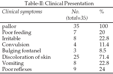 Thrity five infants were diagnosed to have late HDN. It included 24 boys and 11 girls. Ten (28.5%) were born in the hospital of which 6(19%) received vitamin K. The rest were delivered at home or maternity home and did not receive any vitamin K prophylaxis. None of the mothers were on medications during pregnancy, which could alter the coagulation status of these infants. All 35 infants were breast-fed. Mean age of presentation was109 days,earliest presentation on day 28 and longest duration were 280 days. These infants did not have any underlying illness; like liver disease or malabsorbtion syndrome. Mild to moderate fever was reported in 50% of the cases. Table-II Pallor was seen in all infants (100%). Anterior fontanel was tense and bulging in three (8.5%) infants. CT scan showed intracranial haemorrhage in four (11.4%) cases Two infants did not have CT scan but presented with clinical features suggestive of intracranial bleed. Only one (2%) infant had a blood in urine.All babies were born at term. Twenty eight babies were born by normal vaginal delivery and seven by cesarean section, indication of being nonprogression of labour. The place of delivery was home in 25(71%) while 10 were born in private nursing homes.
