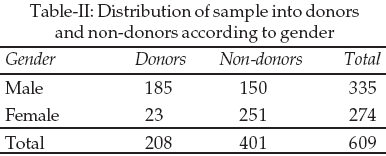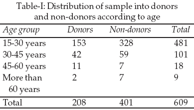 The response was gathered from a total of 609 respondents, the study sample consisted of 335 male (55%) and 274 female (45%). The majority of participants (65.84%) were non-donors. The non-donors group stated that long distance to donation site, transportation difficulty, time commitment, getting a short break from work / office or a time off from home, different fears, mistrust, lake of information and not being approached by anybody to donate were the main factors discouraging them from blood-donation. Table-I shows the distribution of the sample into donors and non donors according to age, the majority of the sample was between the ages of 15-30 years.