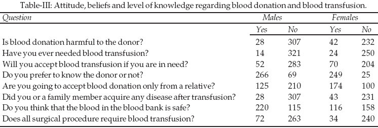 The majority (62.59%) of the non-donors were female and (75.96%) of donors were male, both groups were educated as shown in Table-II. Table-III shows attitudes, beliefs and level of knowledge regarding blood donation and blood transfusion. 88.5% of participants believed that the blood donation is not harmful to the donor because of the screening tests done in blood banks prior to donation, although, 11.5% the majority of who were female believed that blood donation is harmful because of the risk of acquiring an infectious disease. 6.2% of the participants received blood transfusion once in their lives.