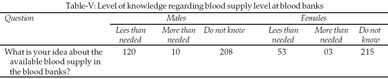 Table-IV shows the gender preference for donation. 58% of the female in addition to 11.34% of the male preferred to receive blood donation from female because they believed that in Saudi Arabia female were less susceptible for acquiring an infectious disease than male. Furthermore, the majority of the participants 69.5% do not know if blood banks were in need of blood or not as demonstrated in Table-V.