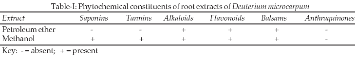 Qualitative analysis for phytochemical constituents from this study revealed the presence of saponins, tannins, alkaloids, flavonoids and balsams (Table-I).