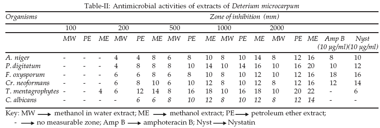The study revealed that Deterium microcarpum possessed significant activity against some pathogenic fungi with the methanol extracts demonstrating the highest activities of 22 and 20mm diameter of zone of inhibition against T. mentagrophytes and P. digitatum respectively, followed by those against A niger, Cr. neoformans and F oxysporum (16mm zone diameter of inhibition in each case) at 2000µg/ml (Table-II).