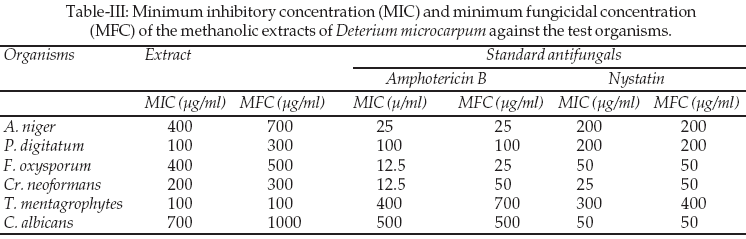 8 All the fungi including A. niger were reasonably susceptible to the extracts (Table). This outcome is contrary to earlier reports 9-12 in which the organism was resistant to all the extracts and antifungal agents tested.9-12 Amphotericin B (AMB) is considered the "gold standard" for treatment of these infections. AMB is however associated with a number of severe and sometimes life threatening side effects including fever, chills and nephrotoxicity. Other treatment regimens include the ‘azole’ antifungal drugs, of which fluconazole and itraconazole are the most widely used. There is however lack of efficacy of and the emergence of resistance to itraconazole and also, limited efficacy of itraconazole against pulmonary aspergillosis. This highlights the need for new antifungal agents with potent and broad spectrum fungicidal activities for the effective management of these infections.13 The extracts were active against agents of invasive fungal infections which are important causes of death in severely immunocompromised patients and since the early 1990s invasive aspergillosis has become predominant.14 Resistance demonstrated by these fungi in previous investigations encouraged the use of drug combinations (amphotericin B (AMB) and rifampin (RIF)) to investigate antifungal activity.12 The fungi used in this study are causative agents of various mycotic infections; C. albicans (Candidiasis), Cr. neoformans (cryptococcosis), A. niger (systemic mycosis-aspergillosis) and T. mentagrophytes (ringworm). The higher MBC values to the corresponding MIC values from our data (Table-III) suggest that the fungal agents could be fungistatic at lower concentrations. Novel antifungal substances can be sourced from Deterium microcarpum for possible development of antifungal drugs for the treatment of systemic and superficial mycotic infections. Further studies on a wide range of bacteria and fungi should however be carried out.REFERENCES