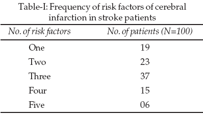 Methodology: It is a descriptive hospital based study conducted at the Department of Medicine, Naseer Teaching Hospital, Peshawar from January 2005 to December 2005. One hundred patients of stroke with cerebral infarction confirmed on C.T. scan brain and more than twenty years of age were included. Risk factors for cerebral infarction were defined in terms of hypertension, diabetes mellitus, ischemic heart disease, smoking, dyslipidaemia, tias (transient ischemic attacks), carotid artery stenosis and family history of stroke.