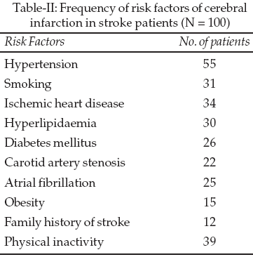 Hypertension was the commonest risk factor found in 55% of patients. Out of 55, 45 patients were known hypertensive and 10 were not aware of hypertension before the occurrence of stroke. There was positive history of smoking in 30% of patients and majority were smoking more than one pack of cigarettes a day for longer than 16 years. Diabetes mellitus was found in 26% of patient. All were cases of NIDDM and they had poor glycemic control. Fifteen patients were using oral hypoglycemic agents regularly, but paying no attention on their diet control. Remaining eleven patients were taking anti-diabetic drugs very irregularly. They were blaming high cost of drugs. Atrial fibrillation was found in 25% of patients, hyperlipidaemia in 30% and ischemic heart disease in 34% of patients (Table-II). Most of the patients were of lower middle class. Average hospital stay was 10 days. Mortality was 8%. Most of our patients (89%) were still dependent for daily activities at the time of discharge from hospital.