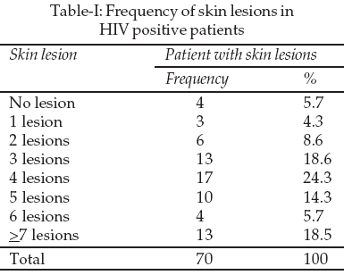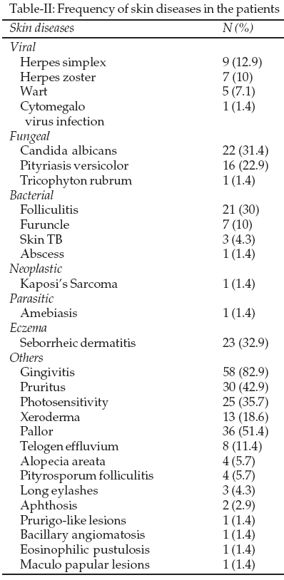This is a cross-sectional descriptive study and included 70 HIV positive patients in the HIV voluntary center of Sanandaj city. Physical examination was performed to identify all possible skin disorders. In cases with doubtful clinical diagnosis of skin disorder, skin biopsies were taken for histopathological examination and also relevant lab. tests were performed. The most recent CD4 counts (cell/mm