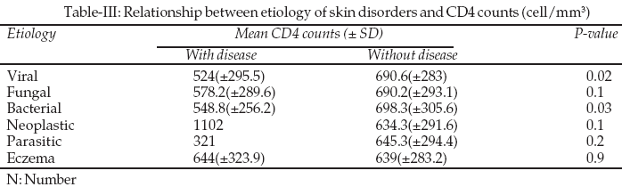 3. There was no significant correlation between CD4 counts and both etiologies of dermatological diseases and total skin lesions. Mean CD4 cell count was lower significantly in individuals with viral and bacterial skin diseases (P =0.02). (Table-III).