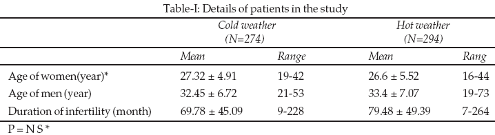 The age range of women and men were 16-24 years, 19-73 years respectively, and the range of duration of infertility was 7-264 months. Patients presented with primary and secondary infertility 77.7%, 22.3% respectively. Two hundred-seventy-four IUI cycles was done in the cold weather and 294 IUI cycles was performed in the hot weather. In the cold weather 24 patients become pregnant, the overall pregnancy rate (PR) was 24/274(8.75%) per cycles, and in the hot weather 18 patients were pregnant, PR was 18/294(6.12%) per cycle (P=0.23).