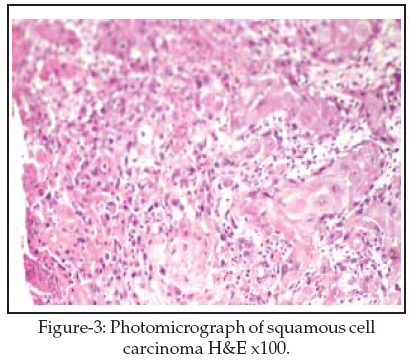 Squamous cell carcinoma (Figure-3) was found to be the commonest neoplastic oral squamous epithelial lesion. There were 379 (92%) cases SCC, NOS. Its variants accounts for 30(7.2%) cases of verrucous carcinoma. One (0.2%) case each of basaloid, papillary and acantholytic SCC was seen (Table-III). Squamous Cell Carcinoma (SCC) was predominantly seen in males. The male to female ratio in our study was 1.19:1. The mean age of the patients was 49.9 years. The peak malignancy score that showed maximum number of cases expressing p53 immunopositivity was 9-12.