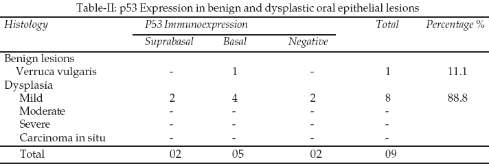 which showed basal p53 immunoexpression (Table-II). However, dysplastic lesion accounts for 10 cases. Out of these three exhibit morphologically papillary pattern with keratosis, parakeratosis and dysplasia while five cases show simple keratosis with mild dysplasia. There were two cases showing features of verrucous hyperplasia (Figure-2). p53 immunopositivity was seen in 8 cases of dysplasia, which showed 75% immunopositivity.