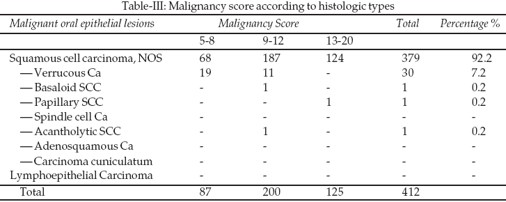 In our series there were 412 malignant oral epithelial lesions followed by 10 dysplastic lesions and a single case of a benign lesion (Table-I). Oral epithelial lesions were common in 5