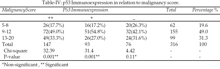 3 and Mirza17 who found p53 immunoexpression in 75% and 73.8% oral squamous cell carcinomas. Langdon and Partridge5 showed 80% of oral cancer patients from United Kingdom with p53 expression. However other workers found lower frequency of p53 immunoexpression i.e. 45% by Yan et al.22 46% by Saranath el at.23 36% by Pillay et al.24 Our findings show that site, age and sex did not influence p53 expression that is in accordance with other studies.5,19There was increase in p53 immunoexpression as the malignancy score rises from 5-8 to 9-12, however this is further followed by decrease in p53 expression as the score rises further i.e. 13-20 showing statistically significant P value.
