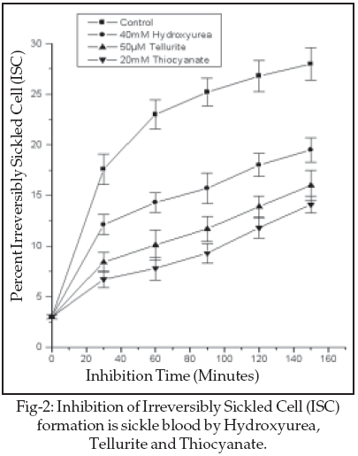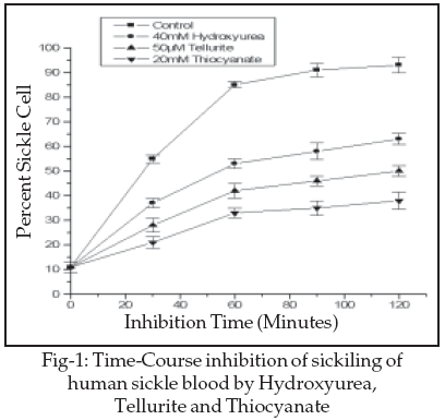The optimum sickling inhibitory concentration for thiocyanate, hydroxyurea and tellurite was found to be 20mM, 40mM and 50µM respectively. These are the minimum concentrations required to achieve maximum inhibition of sickling within one hour. Fig-1 show the time-dependent inhibition of sickling by the three antisickling agents.