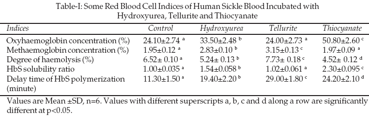 4+) ions can penetrate the erythrocyte membrane and, in the presence of reduced glutathione, form telluride (Te2+) which causes irreversible membrane damage and hence haemolysis.11 Thiocyanate has the highest inhibitory effect on autohaemolysis and osmotic fragility probably because it carbamylates haemoglobin, a modification which increased red blood cell life span.14Oxyhaemoglobin Content and HbS Solubility: The observed significant increase in percent oxyhaemoglobin and HbS solubility of sickle blood treated with thiocyanate and hydroxyurea is a proof that the two drugs have direct interaction with haemoglobin. Polymerisation and subsequent sickling of HbS is favoured when haemoglobin is deoxygenated. Rodgers