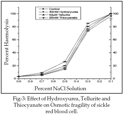 11 while hydroxyurea has been suggested to act in vitro by reacting with haemoglobin to form nitrosyl haemoglobin, a modification which prevent red blood cell sickling.12 The significant decrease (P<0.05) in percent ISC upon incubation with the drugs indicated that they might have a positive effect in maintaining membrane integrity and normal shape of red blood cells during sickling and thereby make them to regain their shape upon reoxygenation. Formation of irreversibly sickled cells has been attributed to conditions such as permanent membrane damage, calcium ion accumulation, repeated sickling-unsickling, ATP depletion and dehydration in some proportion of the red blood cell.13Autohaemolysis and Osmotic Fragility: The degree of haemolysis and osmotic fragility of sickle red blood cell was significantly increased in the presence of tellurite while thiocyanate and hydroxyurea reduced these blood parameters. These results indicated that red blood cell becomes more fragile in the presence of tellurite and may induce haemolytic anaemia in sickle cell patients while thiocyanate and hydroxyurea increased red cell life span. In vitro studies have demonstrated that tellurite (Te