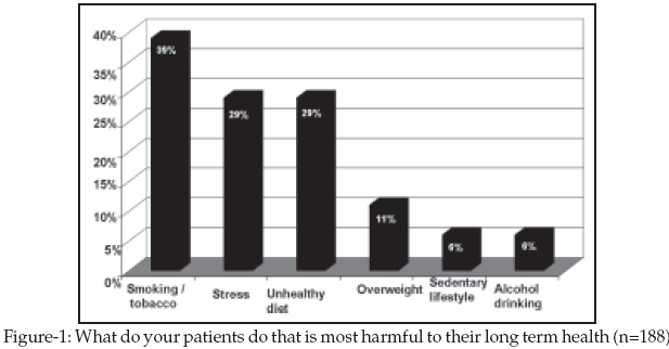 Figure-1 shows that 39% of the Pakistani GPs view smoking as the most harmful activity to their patient’s long term health, followed by stress and unhealthy diet in 29% cases each.
