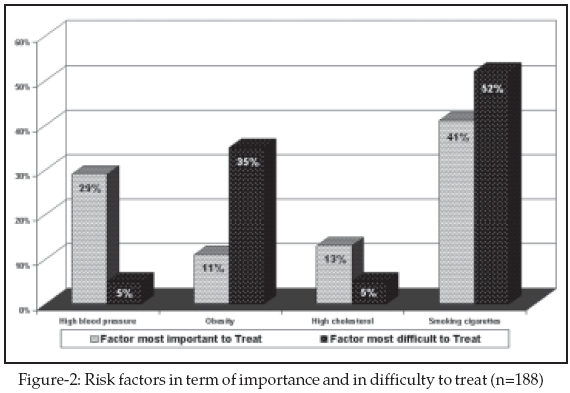 About 41% and 52% of the GPs view smoking as the most important and most difficult risk factor to treat respectively as is seen in Figure-2. 92% of the GPs view smoking as an addictive behaviour, while 94% of them recommend smoking should be classified as a medical condition and would encourage more patients to quit. Only, 55% of our GPs feel that smoking is a life-style choice.