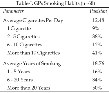 36% GPs who had confirmed that they are smokers themselves, on average consume 12.48 cigarettes per day and have 18.76 average years of smoking. Half of them have been smoking for more than 20 years as is shown in Table-I. and more than a quarter i.e. 34% of the GPs have never tried to quit smoking.When asked about who is best placed to help smokers quit 50% of them responded that all doctors are equally placed while 21% replied that doctors who do not smoke themselves are in a better position to help their patients quit smoking.