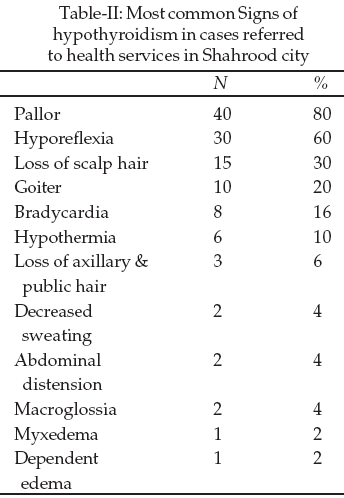 Conclusions: The most common signs and symptoms of hypothyroidism in the central part of Iran (Shahrood city), that is one of the iodine deficient areas in Iran; were different from other studies. Socio-demographic and nutritional status, illiteracy level and personal self-care are among the probable causes. Unfortunately, concomitance of some of the signs and symptoms are not diagnostic for hypothyroidism. It seems that strong clinical suspicious and laboratory confirmation are the only reliable methods for hypothyroidism diagnosis.