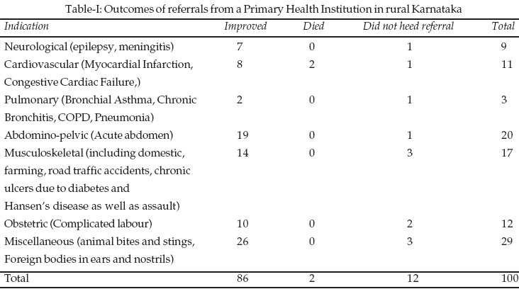 1 primary care referrals in India have not received as much attention. In one study done almost a decade and a half ago, Pratinidhi and others2 described 247 referrals from PHCs. They concluded that the referral system was availed of by most of the patients and that longer distances to the referral institution reduced favorable outcomes.This study was carried out to examine the current nature of referrals from a primary health institution and also to ascertain what the outcomes were in real terms to the patient.
