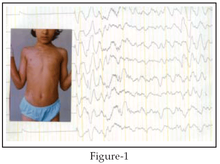 A 9 year- old girl was admitted in our hospital for intractable seizures. She had history of secondary generalized tonic-clonic seizures from early childhood. The familial history proved negative for genetic and heritable familial disorders. The neonatal priod was uneventful. Her past medical history was characterized by seizures attacks from early childhood that was treated with Phenobarbital, carbamazepine and sodium valproate (with optimal doses). On admission the patient was awake and alert. She had minimal mental retardation and had subtle pyramidal tract dysfunction in her right limbs. The hypopigmented streakes and whorls were seen only in the right side of the body (cutaneous lesions were limited to the right side of the body and the left side was uninvolved (as her mother said these skin lesion have existed since infancy). Laboratory examination showed the following significant findings: routine and serologic tests were within normal limits. Ophtalmological examination showed no abnormalities accept hyopigmentation and heterochromia of iris in the right side. In genetic consultation, autosominal dominant pattern of inheritance with 50% peneterance was reported. In the neuroimaging a hypointense lesion in the left parietooccipital lobes were reported (Fig-1). EEG showed a generalized slowness with epileptiform discharges lateralized to left leads (Fig-2). Her seizures were controlled with Depakine chrono and tegretol and for cutaneous lesion no specific treatment was needed.