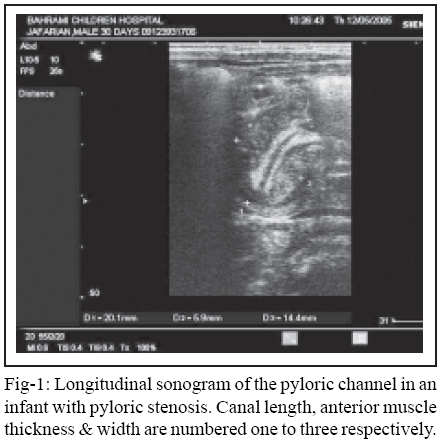 Conclusions: Ultrasound is highly sensitive and specific if pyloric muscle thickness 3 mm is used as cut off point. By virtue of direct visualization of the pyloric muscle, ultrasound is method of choice for both the diagnosis and exclusion of pyloric stenosis in infants.