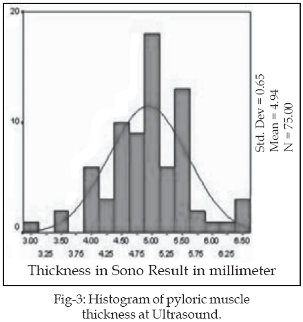 Three hundred and sixty six cases had normal pylorus which was confirmed by follow up. Eighty eight cases had GER, two cases had malrotation and one had duodenal web. Pyloric length was between 16-28 mm (20.22±2.33), width 8.7-17 mm (13.14±1.97) and thickness 3-6.50 mm (4.94±0.65). The Histogram of pyloric muscle thickness is illustrated in Figure 3. Seventy five HPS-positive cases were aged 16-180 days (mean 40.26±23.28 SD); which included 63 boys (84%) and 12 girls (16%). Their weight ranges were 1900-4300 gram (mean3303.60±499.89 SD). Seventy three cases (97.3%) were term and two (2.7%) preterm.