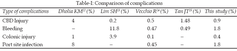 18-20 In this study, four patients (1.8%) developed surgical port site infections, which were managed by simple dressings and oral antibiotics. One of these patients had umbilical stitch sinus which was managed by opening of the wound, removing subcutaneous stitch and appropriate antibiotics. Wound infection was more common in obese patients. The hospital infection committee was informed about all these cases and necessary actions were taken. The reported incidence of surgical port site infection varies between 0.5 to 1%.18-21 The comparison of complications observed in this study with those observed in literature is mentioned in Table-I.CONCLUSION