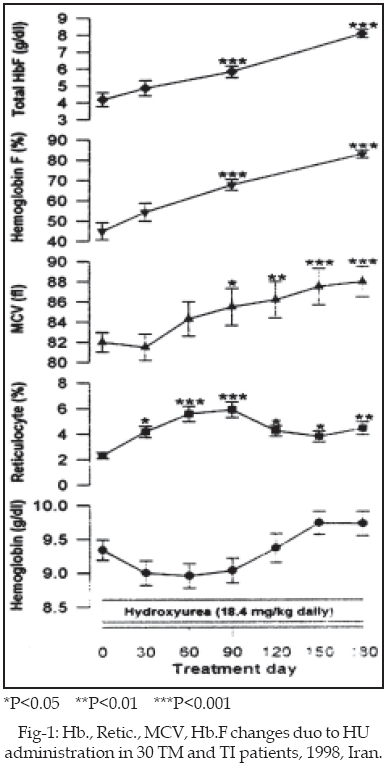 3-5-15,16In our previous report [in farsi] it has been shown that HU was successfully stabilized Hb level in 22 (73.7%) out of 30 thalassemic patients, at 9.7g/dl without transfusions. However, Hb changes were not statistically significant. In that study we also showed that total amount and percentage of fetal hemoglobin changed significantly (P<0.001).