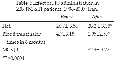 In June 1998 the trial was started with thirty patients summary of the results is shown in Table-I. From 1998 to Dec 2007 HU was tried on 297 patients and in 2007, two hundred patients (67.3%) of primary sample were currently on HU. Two hundred and forty eight patients (83.8%) had regular blood transfusions prior to the trial(TM) patients and 49(16.2%) were TI. One hundred fifty three patients (52%) were male. The age at diagnosis, first transfusion for (TM), starting HU and finally the age at time of the study were 5.3± 6.2, 6.2±6.9, 17.5±7.8 and 23±8.8 years respectively. The mean dose of HU was 15.5 ± 6.4 mg/kg /day and duration of using the drug was 7.46 ±1.62 years (ranging 0.5-9.5 years).