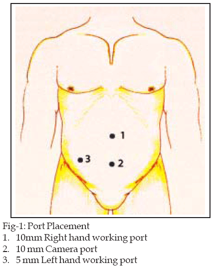 st January 2007 to 30th April 2008 were included in the study. Patients were placed supine on the operating table and general anesthesia was used in all patients. After induction, an indwelling urinary catheter was placed to decompress the bladder, which was removed at the end of surgery. The surgeon and camera assistant stood at the patient’s left side, facing the video monitor placed at the right side of the table.Pneumoperitoneum was established using open Hasson technique through a 10-mm infraumblical incision. A forward-viewing 10-mm laparoscope was inserted into the abdominal cavity and diagnostic laparoscopy was performed, then under video guidance another 10mm port was inserted 2cm above the pubic symphysis in the midline and the telescope was transferred to suprapubic site. Another 5mm port was introduced in the right iliac fossa. (Fig-1) The umbilical and right iliac fossa ports were used for the right and left hand instruments respectively.