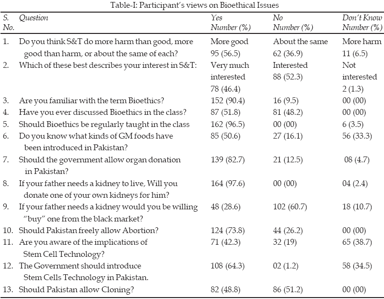 Results: Most of the participants were graduate students having relatively better knowledge of Science and Technology as 90.4% of them were found to be familiar with the term "Bioethics". It was encouraging to note that students at this level of education had positive opinion about the role of Science and Technology and had accepted its importance in their daily lives. The fact that the students are eager to learn more about bioethical issues was borne out by our data as 96% students were of the opinion that Bioethics should be taught regularly in the classes. There was a general agreement among the respondents that the government’s policies on Bioethical issues are not satisfactory and that the issues need to be addressed; albeit within the frame work of religious (Islamic) teachings. The survey indicated that Cloning, Organ donation, GMO’s, Contraception, Abortion and Stem Cell Research are regarded as the most important bioethical issues.